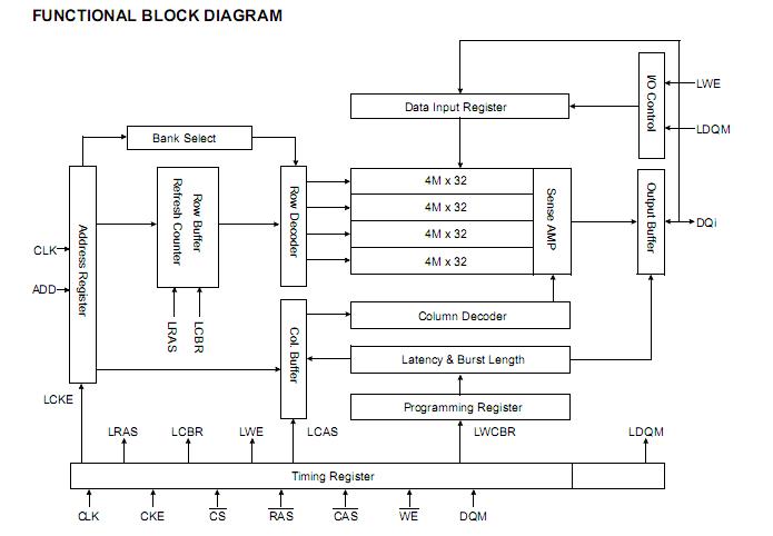 K4M513233C-DN75 features: (1)3.0V & 3.3V power supply; (2)LVCMOS compatible with multiplexed address; (3)Four banks operation; (4)MRS cycle with address key programs; (5)EMRS cycle with address key programs; (6)All inputs are sampled at the positive going edge of the system clock; (7)Burst read single-bit write operation; (8)Special Function Support: PASR (Partial Array Self Refresh), Internal TCSR (Temperature Compensated Self Refresh); (9)DQM for masking; (10)Auto refresh; (11)64ms refresh period (8K cycle); (12)Commercial Temperature Operation (-25℃ to 70℃); (13)Extended Temperature Operation (-25℃ to 85℃); (14)90Balls FBGA ( -SXXX -Pb, -DXXX -Pb Free).